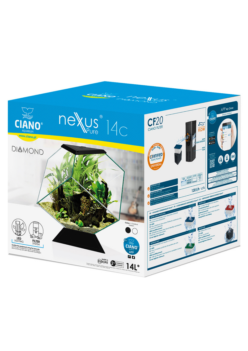 אקווריום שחור/לבן מעוצב בצורת יהלום ציאנו נקסוס 14C כולל פילטר - Ciano Nexus